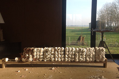 Ik heb bladeren, uit een boek gesneden, samengevoegd met porseleinaarde en daarna gebakken, op 1280 graden. Het blad is verast, de porseleinaarde versteend. Het gebakken kleinood houdt de herinnering aan de boeken in stand, verhevigt die.