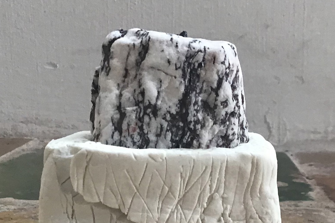 De beelden van klei en steen zijn een zoektocht naar het gedrag van deze materialen bij het gezamenlijk bakken op meer dan 1100 graden.