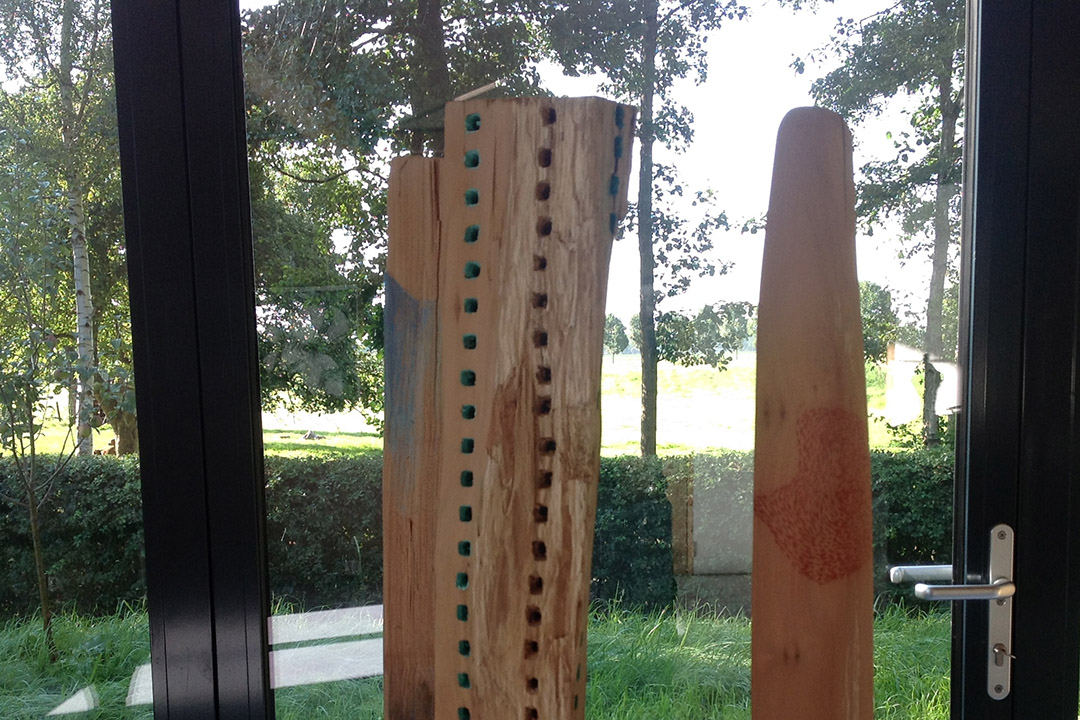 Bij de houten landschapsbeelden richt ik me op details van het landschap die sterke indruk op me maken, zoals bijvoorbeeld een akker waar de maisplantjes net boven de grond uitsteken.